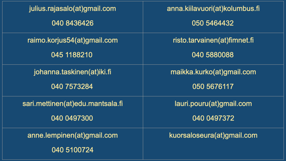 Muistakaa pitää omat yhteystietonne päivitettyinä, jotta tiedotukset tavoittaisivat teidät. Älä jaa muuttuneita tietojasi yllä olevan lomakkeen kautta, vaan lähetä ne sähköpostitse osoitteeseen kuorsaloseura(at)gmail.com. Rekisteri- eli tietosuojaseloste löytyy sivun alatunnisteesta.