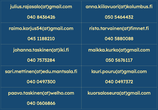Mikäli sinulla on ilmoituksia, juttuja, kuvia, palautetta tai muuta kysyttävää voit olla yhteydessä meihin osoitteeseen kuorsaloseura@gmail.com tai allaolevien yhteystietojen kautta. Vaihtoehtoisesti voit lähettää viestisi lomakkeella.