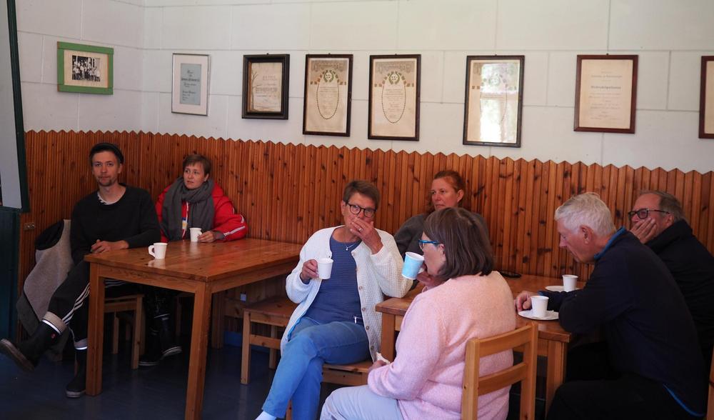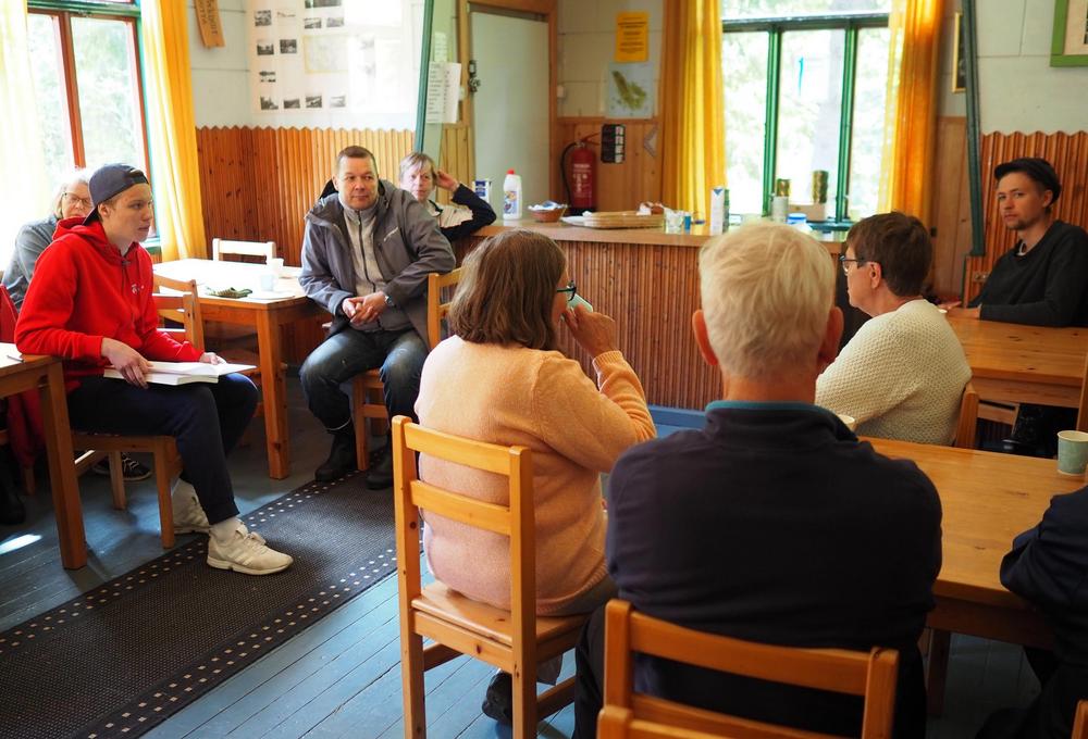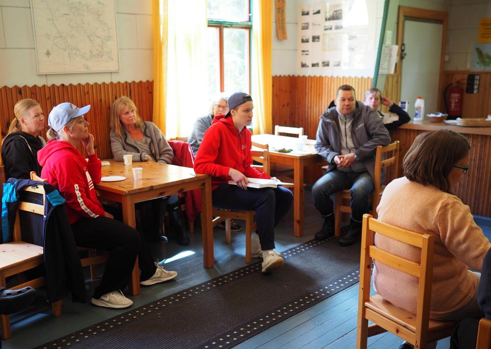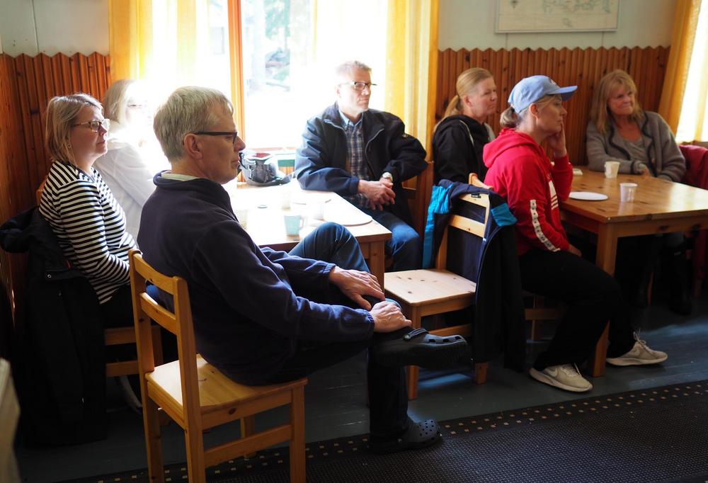Tuulisessa ja koleassa "kesä"säässä liki 20 saarelaista oli kerääntynyt tuulensuojaan Seurantalolle juttelemaan elämästä Kuorsalossa talviaikaan.