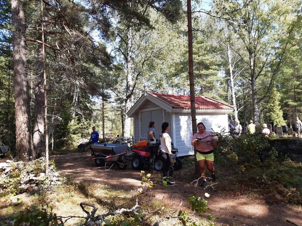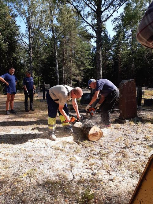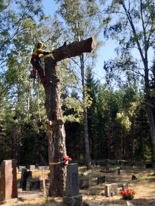 Vanhojen, huonokuntoisten puiden kaato Kuorsalon hautuumaalla jatkui lauantaina 10.8.2019 ammattimetsurien johdolla ja runsaslukuisen talkooväen avustuksella. Vaativa työ sujui suunnitelmien mukaan ja vaarallisiksi käyneistä puista päästään vähitellen eroon. Kiitos talkooväelle! Työ jatkuu la 31.8. Ohessa kuvia Katja Arvilommin kamerasta.