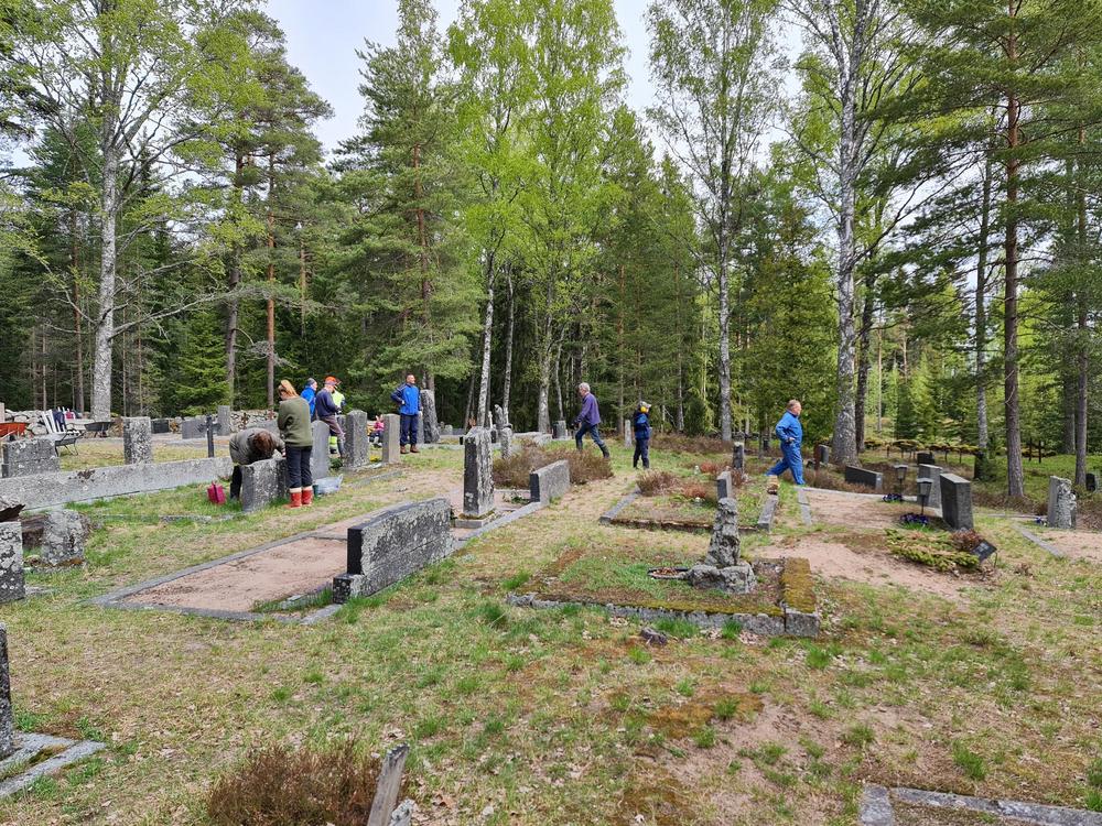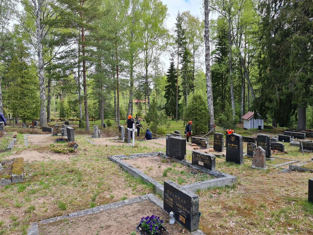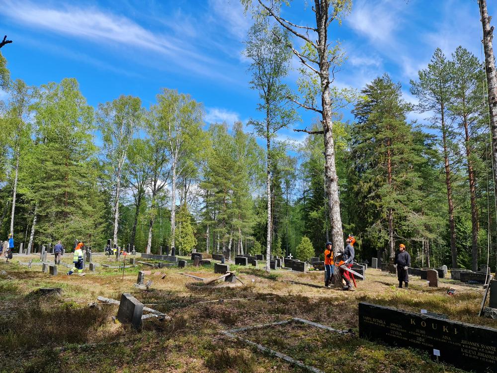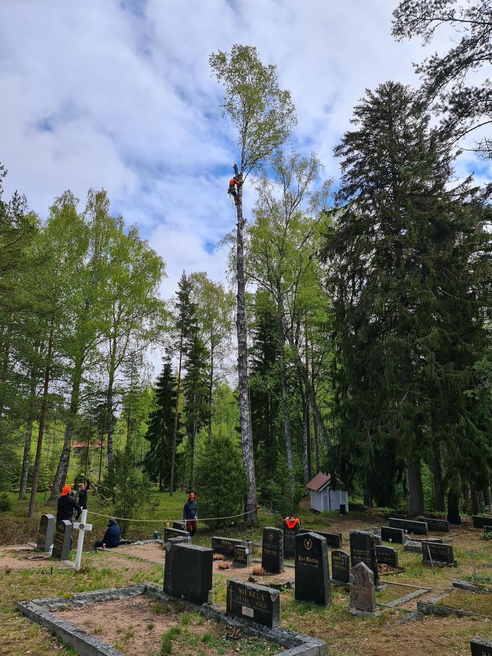 Aurinkoisessa mutta hieman koleassa säässä saatiin 3 isoa koivua turvallisesti kaadettua Kuorsalon hautuumaalta kiipeilevien ammattimetsureiden toimesta. Saarelaisten talkoojoukko avusti ja siirsi puutavaran porttien ulkopuolelle, josta sitä saa vapaasti hakea polttopuuksi.
